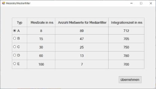Einstellung der Messrate pro Sekunde für den Medianfilter und Sensortyp